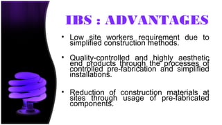 Advantages and Disadvantages of Industrialized Building System Advantages Disadvantages Cost saving long run The formwork of IBS components are mostly made of materials that can be used repetitively ie. IBS is not a common practice for projects located in rural areas.